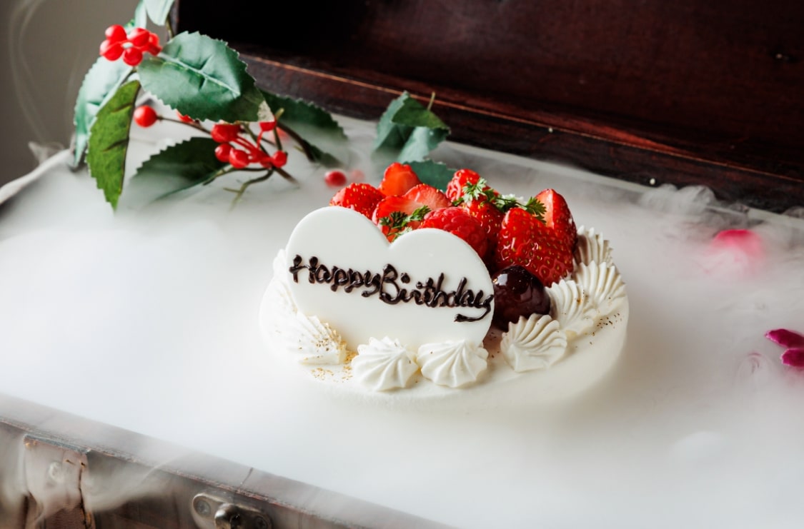 多くのお客様に記念日の祝福の場としてご利用いただいている当店では、記念日コース限定の「ケーキ付き宝箱」をご用意。華やかに盛り付けられた宝箱に、特別な日を彩るケーキを添えてご提供いたします。単品でのご注文は承っておりませんが、大切な人へのサプライズに最適。ご利用の際は事前予約が必要となりますので、お気軽にお問い合わせください。