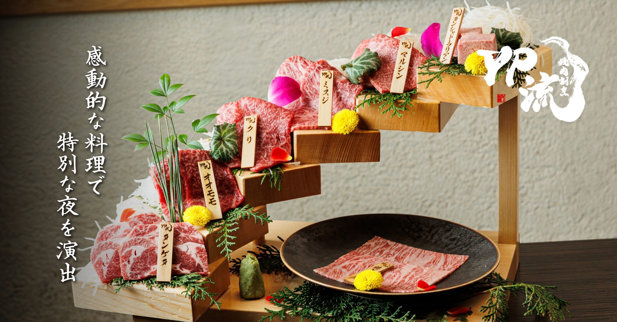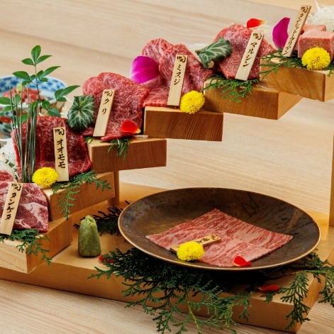 厳選した部位を美しく階段状に盛り付けた、当店名物「花の階段盛り」。一段ごとに異なる部位を味わい、それぞれの旨みや食感の違いを楽しめます。華やかな盛り付けと上質な肉の味わいが、特別なひとときを彩ります。