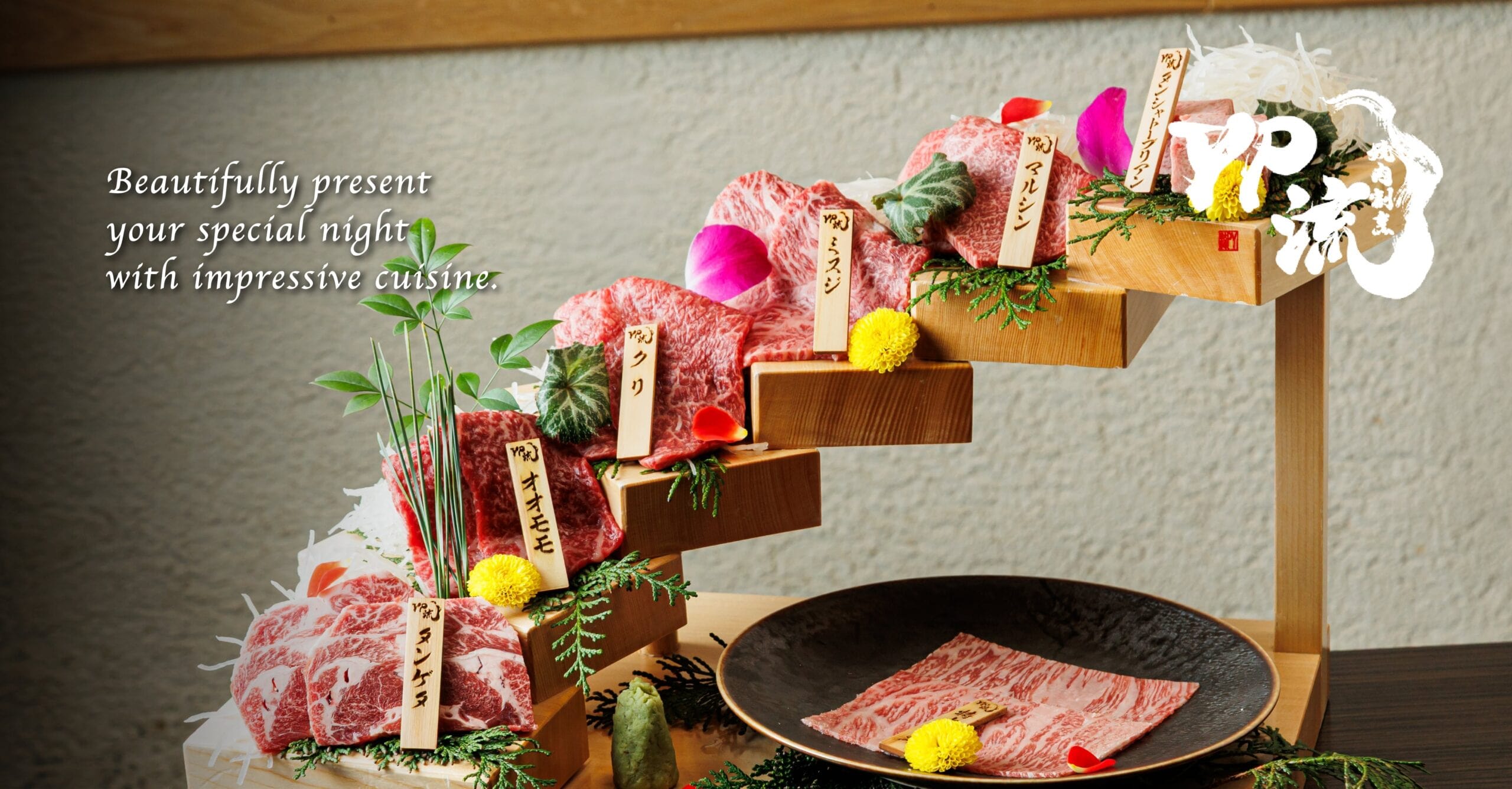 Our specialty, Flower Steps, is carefully selected cuts arranged in a beautiful tiered pattern. Each tier contains a different cut that you can enjoy the different textures and flavors. The gorgeous presentation and the taste of quality meat will add color to your special moment.